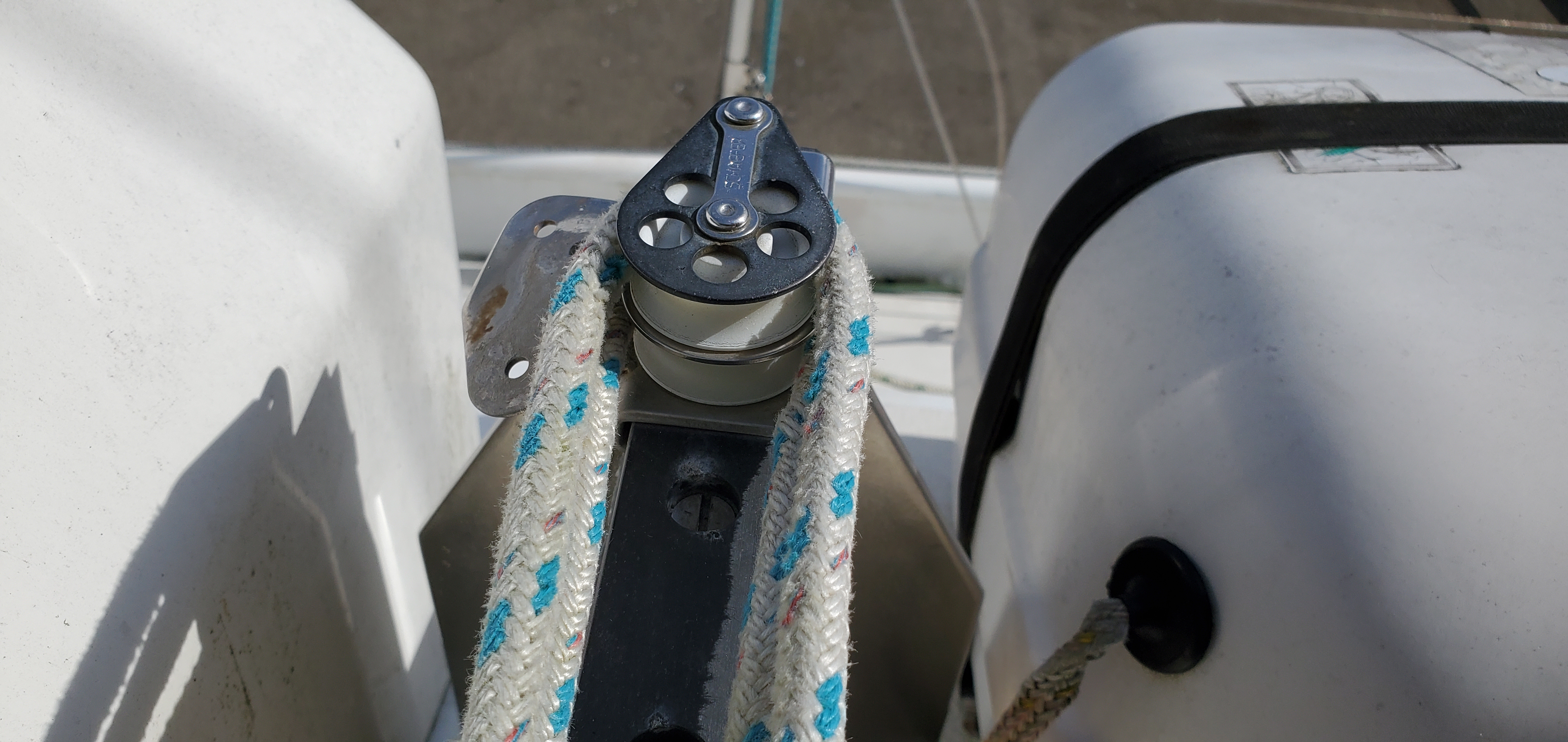 I hadn’t looked at the mainsheet traveller car in a while. I had felt some friction in the tired control line, and blissfully planned to replace the line and have a well-functioning system again. However the closer I looked, the more I noticed should be addressed. Loose & corroded components, and parts on the brink of failure stared back at me, giving me a relatively gentle lesson in maintenance and inspection of critical systems.