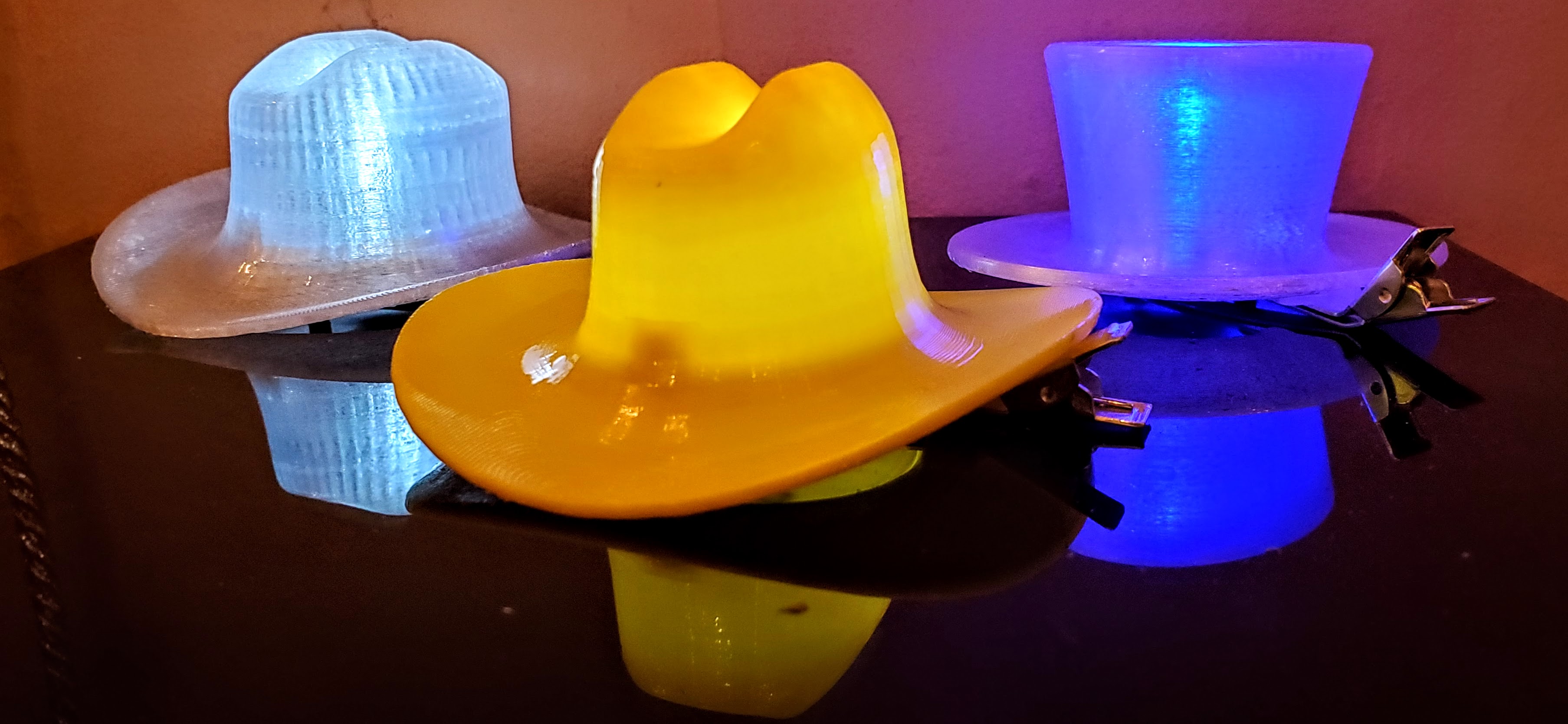 Originally conceived of for dressing up family pets, these tiny hats with integrated LED quickly gained traction on human heads. Perfect for any occassion, fits most heads except mine (needs hair).